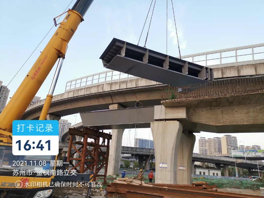 金枫立交西转南匝道新建工程(WS03-WS05)钢箱梁,是我公司2021年新签订项目之一。目前厂内加工制作还在进行中,部分成品已运送至现场。2021年11月8日,现场开始进行吊装施工作业。