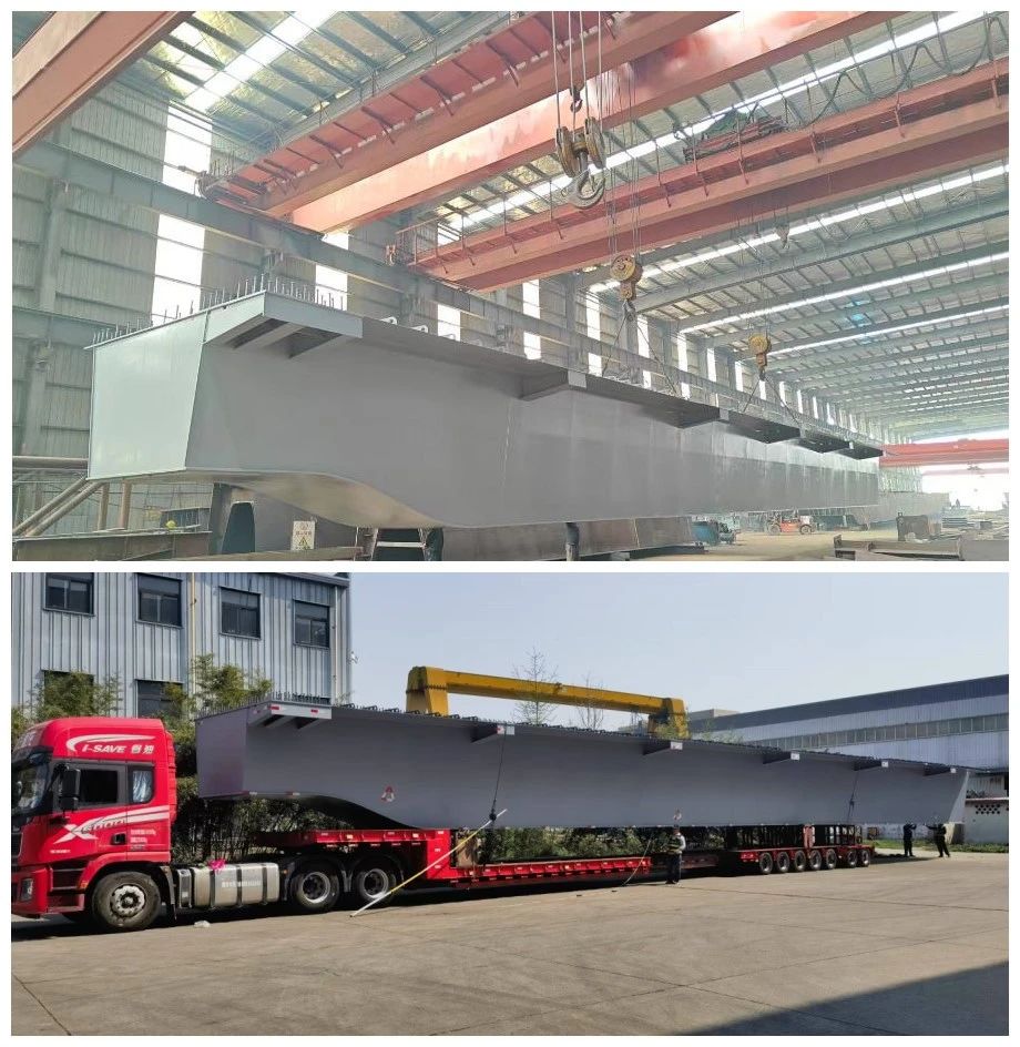 现场施工中,项目团队针对现场吊装环境复杂:①现场位于交通繁忙的十字平交路口,不满足设置二拼场地的要求;②现场交通车流量大,不能进行全封路吊装;③构件分段尺寸大,吨位重,道路运输安全风险高,现场安装采用少支架的大节段原位吊装方案。项目厂内钢组合梁加工采用大节段制作工艺(最大节段长度35m),减少现场临时支墩布置及现场吊装工作内容,便利于现场交通组织。钢梁运输充分研讨运输安全保障事宜对路线实地勘察优选运输路线,办理大件运输许可,严格按规定时间和路线运输。现场安装根据施工吊装工况进行模拟,确定吊车的合理站位,起吊前安排专人对吊车的吊具、钢丝绳及机械性能进行全面排查,保证起吊设备运行情况良好。