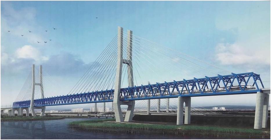 徐盐铁路盐城特大桥,于2017年6月开工架设。主桥为连续钢桁斜拉桥,桥长648米,跨新洋港南北岸对称布置。主桥采用两片主桁,索面为平行双锁面结构,上、下弦杆均采用箱型截面,腹杆采用箱型截面或H型截面,总用钢量约12000吨。(甲方:中铁四局钢结构制造有限公司)
