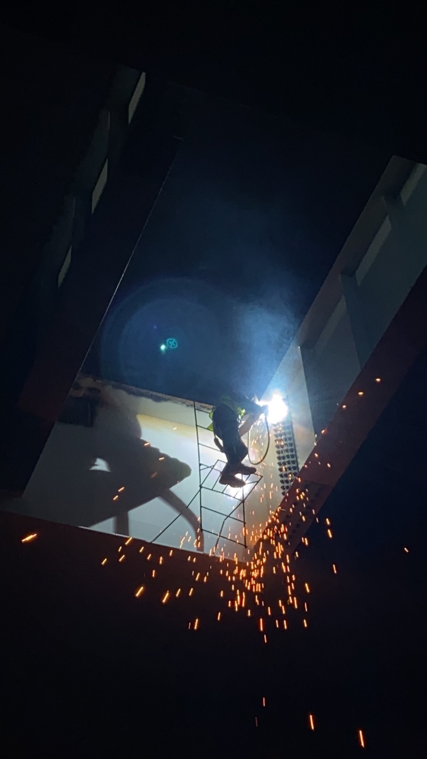 成都新机场高速项目跨绕城高速的施工现场,工人日以继夜,轮班上岗,奋战在艰苦的环境里,到今日凌晨两点,D6匝道桥面铺板焊接,10联工字梁正在安装。